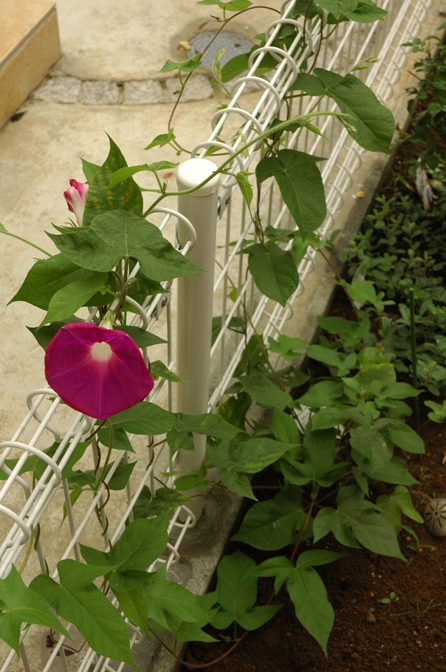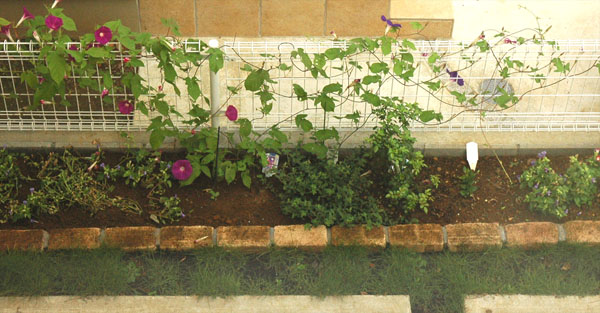 花壇の奥側には朝顔の苗を植えた。