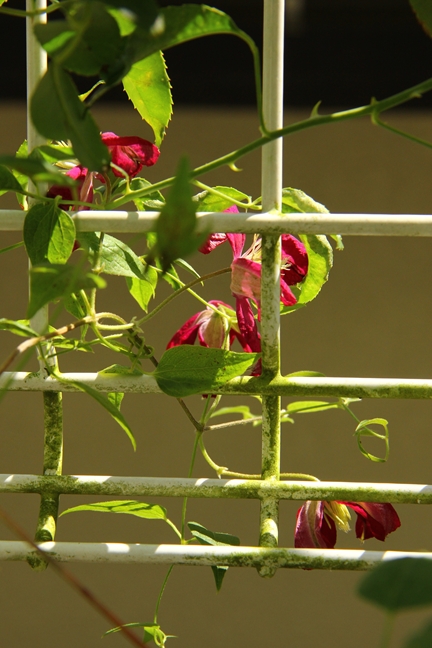 蔓が旺盛に伸びるのでこのトレリスでは足りず、てっぺんが宙に浮いている…。