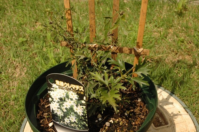 トレリスを設置。すでに植わっているところへ差したのでうまくいかず