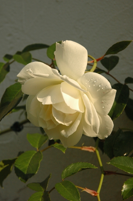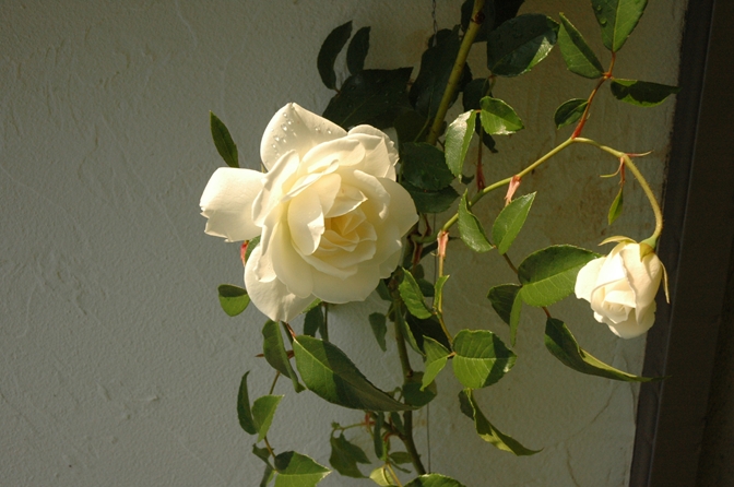 庭の壁面に這わせたつるアイスバーグ(6号鉢で購入、地植え)が開花。