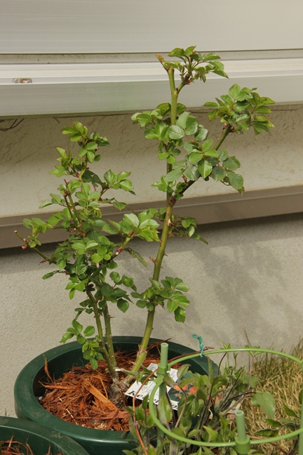 遅れて芽吹いたバフビューティの鉢はいつ北に移動しよう…
