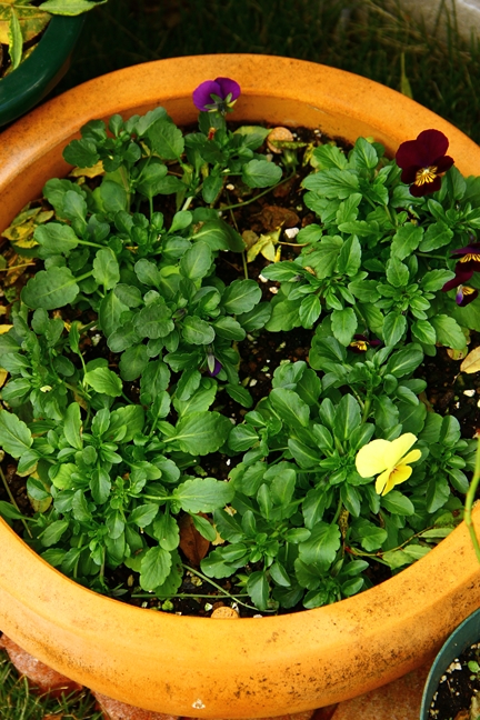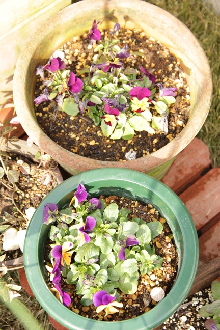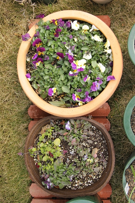 ビオラの成長具合比べ。驚いたのはネコブ土のはずの鉢が