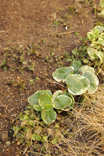 青々してるのはツルニチニチソウ。勝手に伸びて増える。
