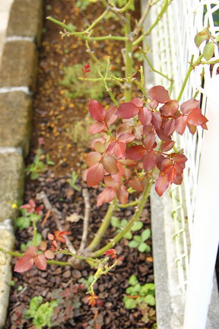 黒星で丸坊主になったジャルダンドゥフランスはまっさらの赤い新芽と蕾も。