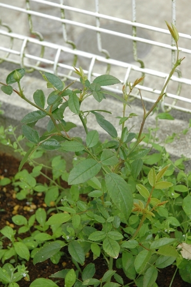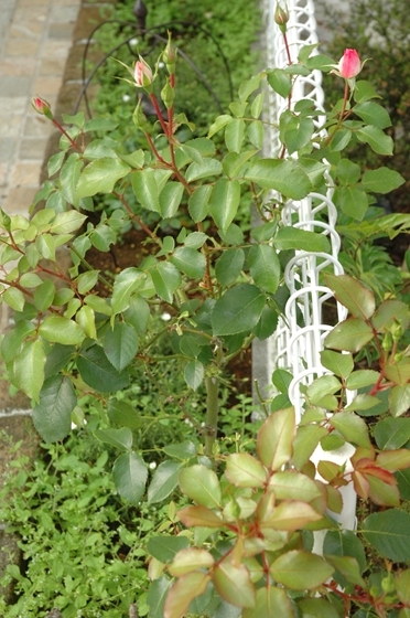 玄関側のポリアンサローズは新芽とつぼみの勢いがすごい。
