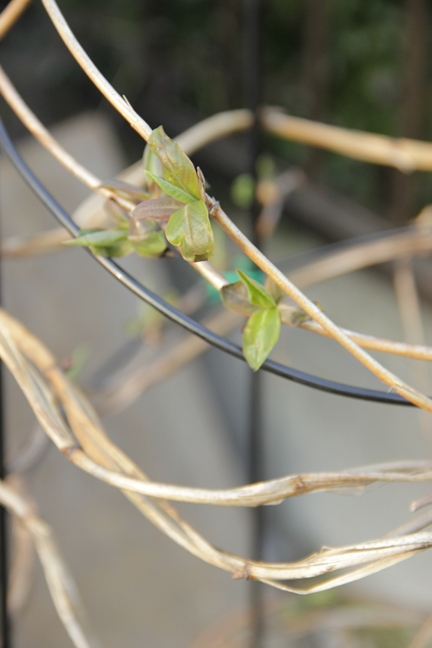 移植といえば鉢に移したハニーサックルは葉っぱが殻を破るようにして