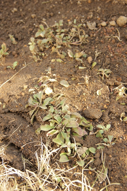 うっすらした西日の恩恵を頼りにか、そろそろと芽が。