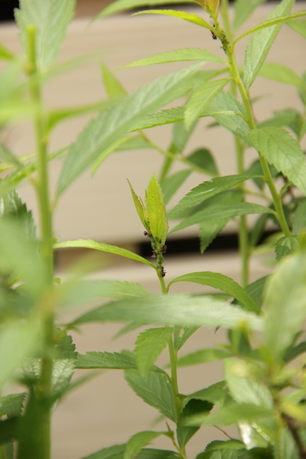 右:やはりシモツケについたアブラムシとそれを捕らえるアリ