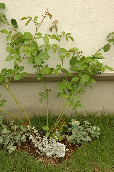 庭側の家の壁に這わそうと植えたつるアイスバーグの足もとに