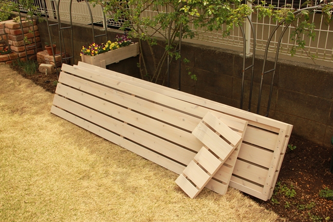 壁に貼る板届いたので設置したらシマトネリコの根元に植える予定。