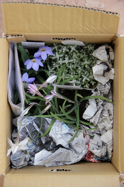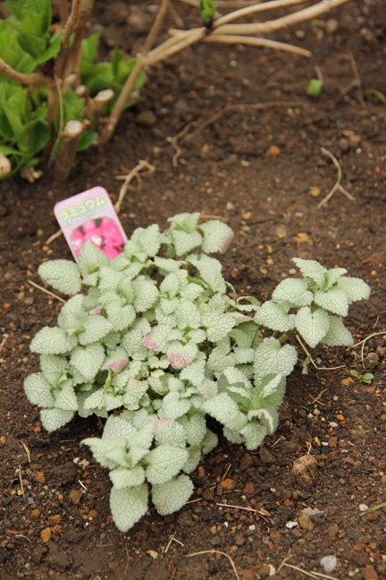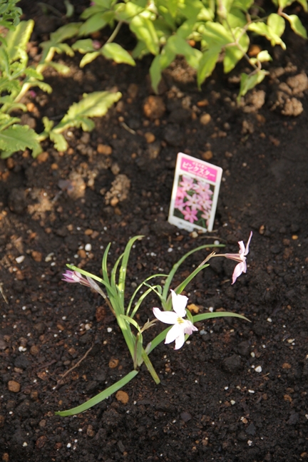 植え付け待ちの苗のうちハナニラをレイチェルボウズライアンの足元に。