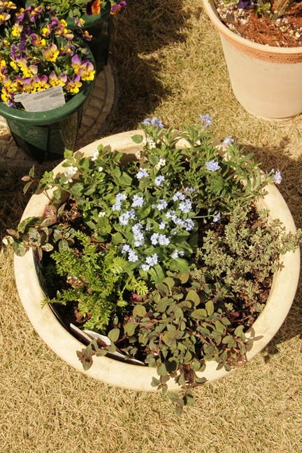 寄せ植えの鉢にワスレナグサとミヤマホタルカズラを足した。