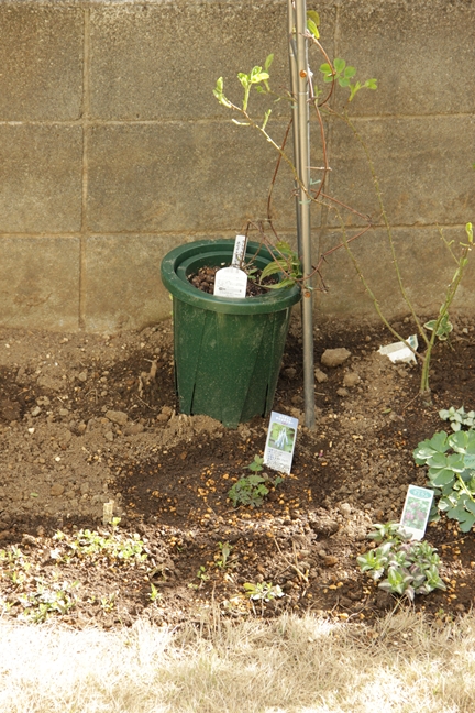 悩んだ結果、ジュリアンにちょっとどいてもらって保留鉢花壇の手前に。